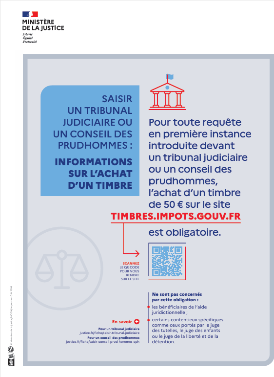 Pour certaines procédures civiles, l’achat d’un timbre dématérialisé de 50 € est obligatoire. Il doit être acheté en ligne par carte bancaire (format PDF ou SMS à 16 chiffres) par le demandeur ou son avocat avant de saisir le tribunal.